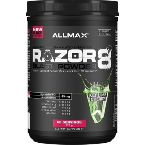 Razor 8 Blast Powder - это предтренировочный комплекс, где огромное значение имеет не только ингредиенты, но и пропорции в которых эти ингредиенты сочетаются. Все это, до малейших мелочей учтено лабораторией AllMax Nutrition и как результат на тренировке Вы получаете все к чему стремитесь: моментальная фокусировка, внимание, экстремальная энергия, улучшенное кровообращения и, конечно же, сила! ВЗРЫВНАЯ СИЛА!